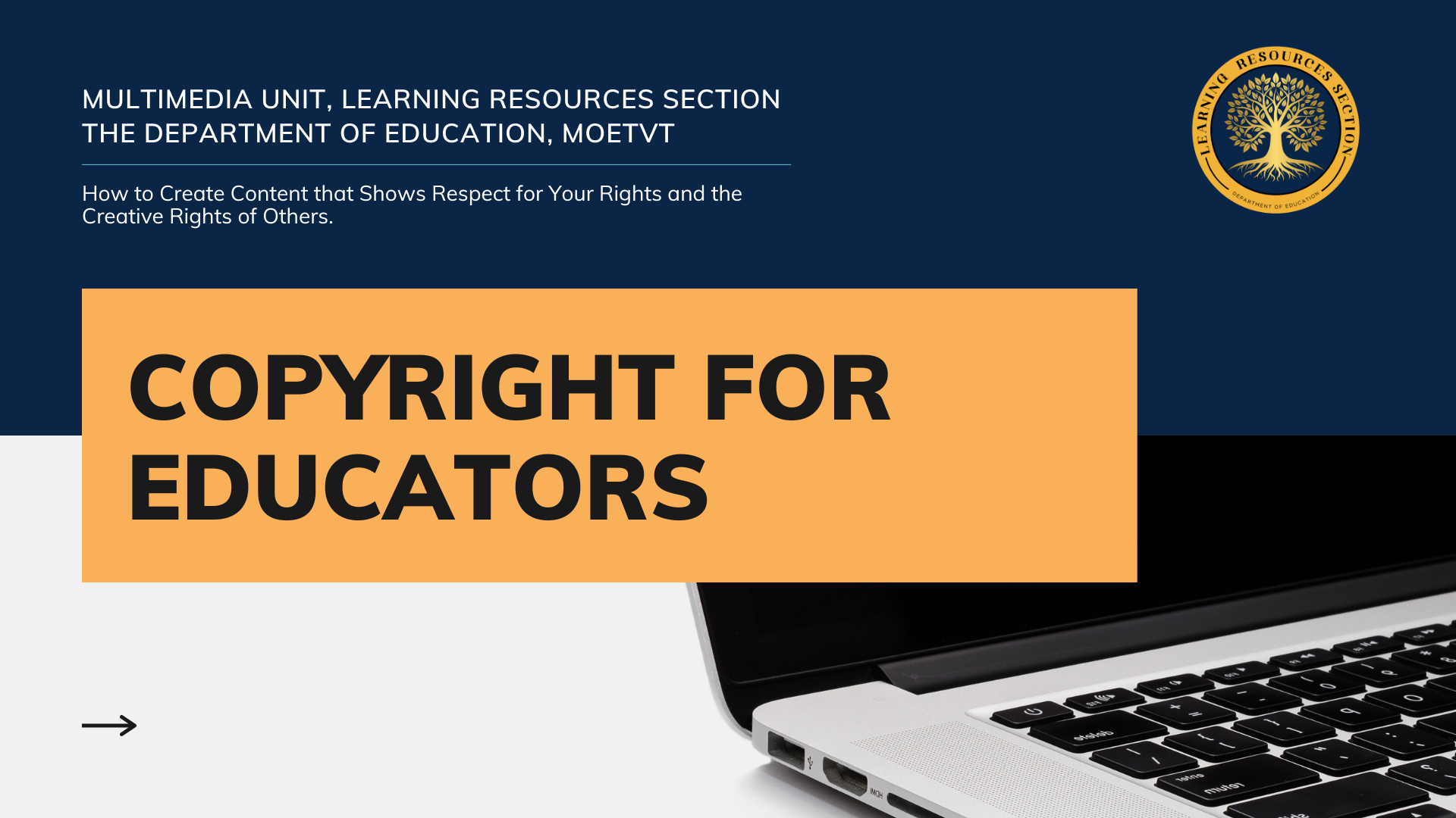 Copyright is an important part of the creative process in education. As a matter of fact, Educators are arguably the largest group of creators in The Bahamas, with a workforce of almost 3,000 teachers and hundreds of educational professionals. When one factors in students, and other members of the public, it is clear that from architects, to visual artists, writers, choreographers, performers of all types and more, Bahamians are creative. How do we ensure that ownership and use of creative material is correctly used and attributed while meeting or exceeding international standards? Well, first, we must know the Basics. This e-course produced by the Multimedia Unit from the Learning Resources Section of the Department of Education and in collaboration with the Professional Development Section aims to ensure that educators know their rights, privileges and responsibilities under the law.